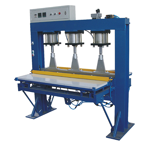 半自動條形熱壓機是將短木芯板經過斜磨、涂膠后進行熱壓拼接的一種新產品,它是利用電熱管對熱壓板加熱,上置式氣缸加壓,前后自動送板機構送料來實現(xiàn)動作的。工作時只需將單板推到臺面限位擋板處,按下按鈕或腳踏開關,機構將自動將單板夾緊、送料及熱壓,并按設定的時間自動脫開,完成熱壓拼接工藝。
