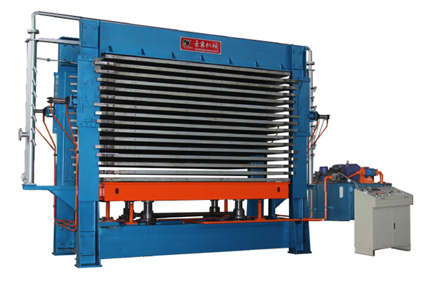 本機適用于旋切芯板的除濕干燥、整平。在熱壓干燥機上安裝有二套擱腳機構,使壓機中各層熱壓板與芯板可實現雙工位開合,從而實現快速排汽和收縮。機架采用框架結構,上進油口式油缸。安裝調試方便,基礎投資少,采用飽和蒸汽作為載熱體加熱熱壓板,生產效率高,排濕整平過程按預定工藝由電氣自動化控制。
